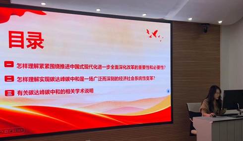 王小菁同志就党的二十届三中全会通过的《中共中央关于进一步全面深化改革、推进中国式现代化的决定》提到的新时代全面深化改革的重大成就、深入推进中央生态环境保护督察主要的要求及有关中央生态环境保护督察的相关文献分享三个方面进行了分享。徐成英同志就党的二十届三中全会通过的《中共中央关于进一步全面深化改革、推进中国式现代化的决定》提出的紧紧围绕推进中国式现代化进一步全面深化改革的重要性和必要性、实现碳达峰碳中和是一场广泛而深刻的经济社会系统性变革及有关碳达峰碳中和的相关文献三个方面进行了分享。