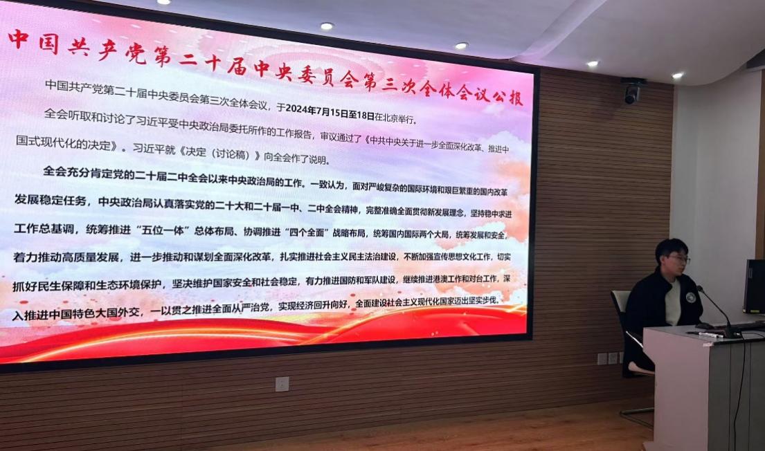 最后,支部组织委员齐子涵同志领学了中国共产党第二十届中央委员会第三次全体会议公报、习近平给中国传媒大学全体师生的回信、在庆祝中华人民共和国成立75周年招待会上的讲话、在全国民族团结进步表彰大会上的讲话等内容,支部党员同志认真学习领会重要指示精神,并引发热烈反响,纷纷表示要坚持学习党的二十届三中全会精神,凝心聚力、奋发进取,为全面深化改革、推动中国式现代化建设贡献新时代青年力量。