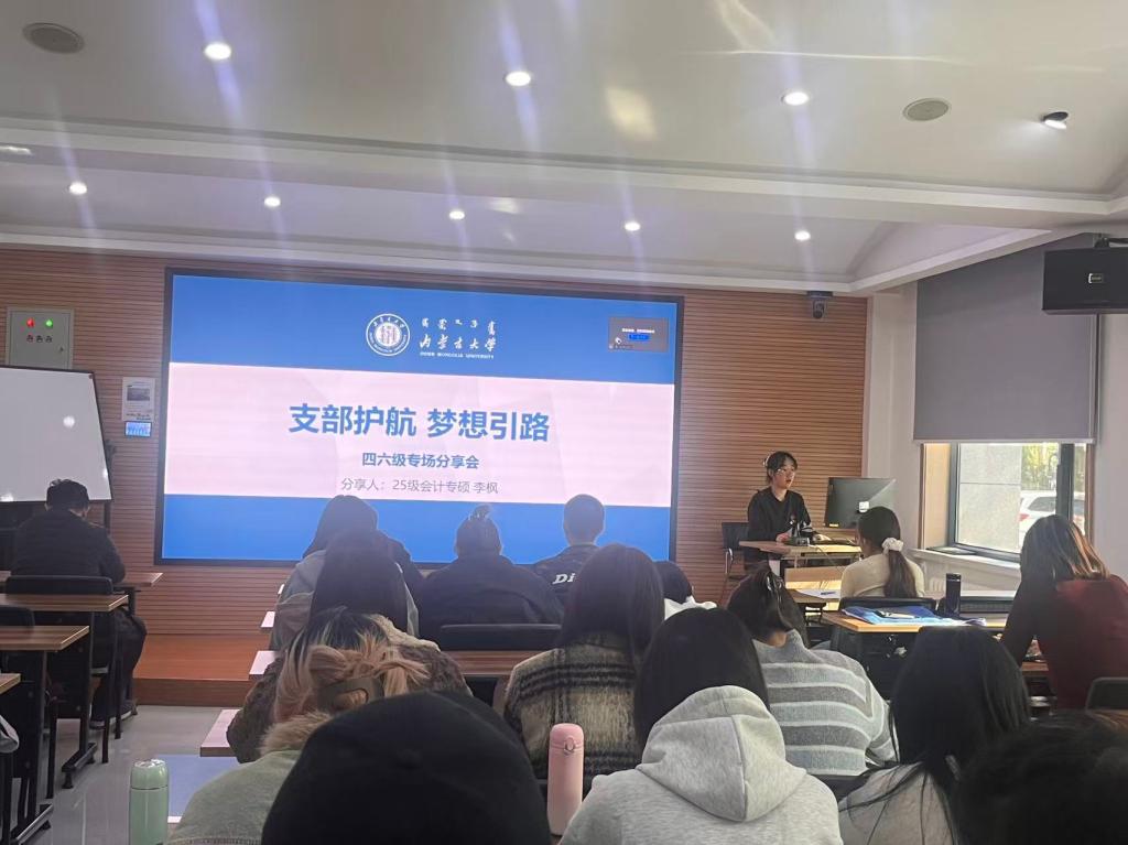 为全面落实《太阳集团tcy8722关于加强学风建设的实施方案》,实施“党建引领·学风共建”活动,2025年10月31日,太阳集团tcy8722会计专硕研究生党支部在知行楼108教室,以线上线下结合的形式举办了“党员先锋·榜样领航”优秀学子经验分享会暨“支部护航·梦想引路”四六级专场分享会。本次活动旨在通过榜样的力量激发广大学子的学习热情,提供精准的学业帮扶,营造积极向上的优良学风。分享会由支部书记曹以伦主持,支部全体党员、入党积极分子40余人参加活动。