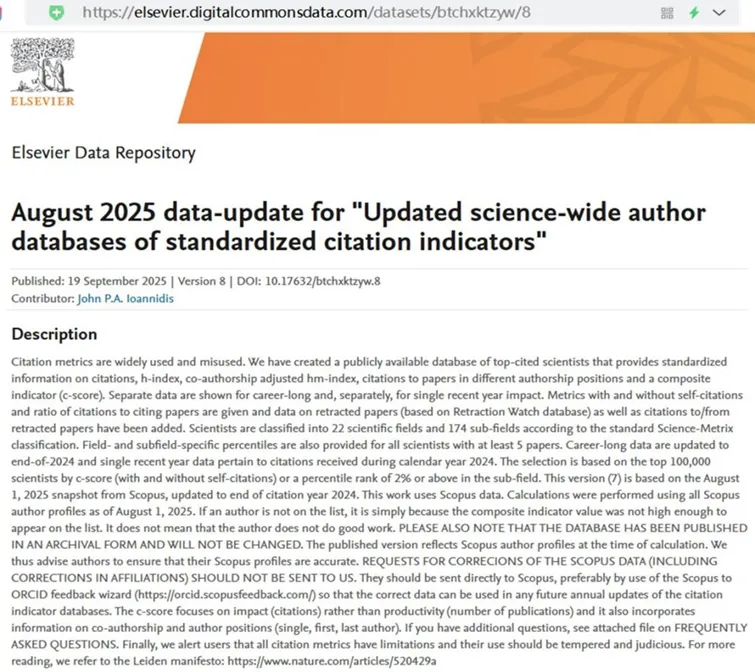2025年9月20日,美国斯坦福大学(Stanford University)和国际权威学术出版社爱思唯尔数据库(Elsevier Data Repository)共同发布了2025年度第八版《全球前2%顶尖科学家榜单》。我院青年教师陈鹏宇与陈文两位研究员成功入选年度科学影响力榜单,其中陈鹏宇研究员已经连续两年荣登该榜单。