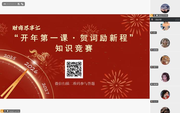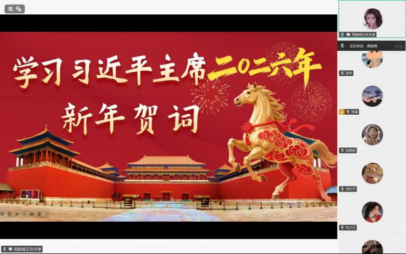 2026年1月16日下午,太阳集团tcy8722本科生二支部以“开年第一课·贺词励新程”为主题,通过腾讯会议开展线上主题党日,学习习近平主席年二〇二六年新年贺词,引导党员同志深刻感悟时代发展、明晰青年责任担当。支部书记周毅嵘主持并领学,支部全体党员参加了学习。