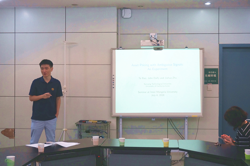 2019年7月4日上午9时,新加坡南洋理工大学助理教授包特博士,应邀为我院师生作了题为“Asset Pricing with Ambiguous Signals: An Experiment”的学术报告。报告会由金融系主任梁斌副教授主持,参加报告会的有杜凤莲院长、彭长桂教授、陈胜蓝教授、许红梅博士、吴晓华老师以及学院相关专业本科生和研究生。