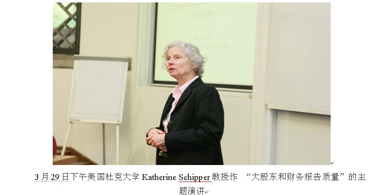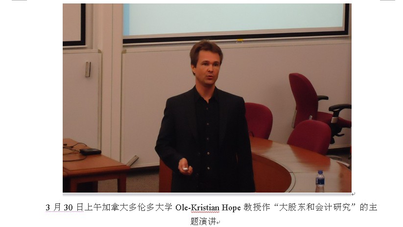 在3月29日下午和30日上午的主题报告上,美国杜克大学Katherine Schipper教授和加拿大多伦多大学Ole-Kristian Hope教授分别作了“大股东和财务报告质量”以及“大股东和会计研究”的主题演讲。在报告中,他们系统梳理了国外多年来会计领域对大股东的研究方向和内容。在一天半的会议中,来自国内外的8位论文作者做了精彩的报告,主体涵盖了:大股东与企业价值,大股东与盈余管理,大股东、信息披露与透明度,大股东与掏空,大股东与董事会、独立董事。通过本次会议加深了对会计领域研究的了解,也和很多国内外学者建立了友谊,更重要的是为我院会计专业的发展提供了新思想和新领域。