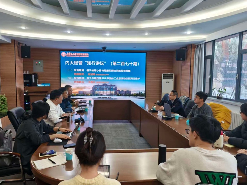 2025年12月13日,我院成功举办第270期“知行讲坛”。本期讲座特邀南京航空航天大学赵旭峰教授与王路兵博士,分别作了题为《基于故障小修与隐蔽故障追溯的维修策略》与《基于不确定性RUL评估的工业系统动态预测性维护》的学术报告。我院青年教师听取了报告,讲坛由副院长周瑜主持。